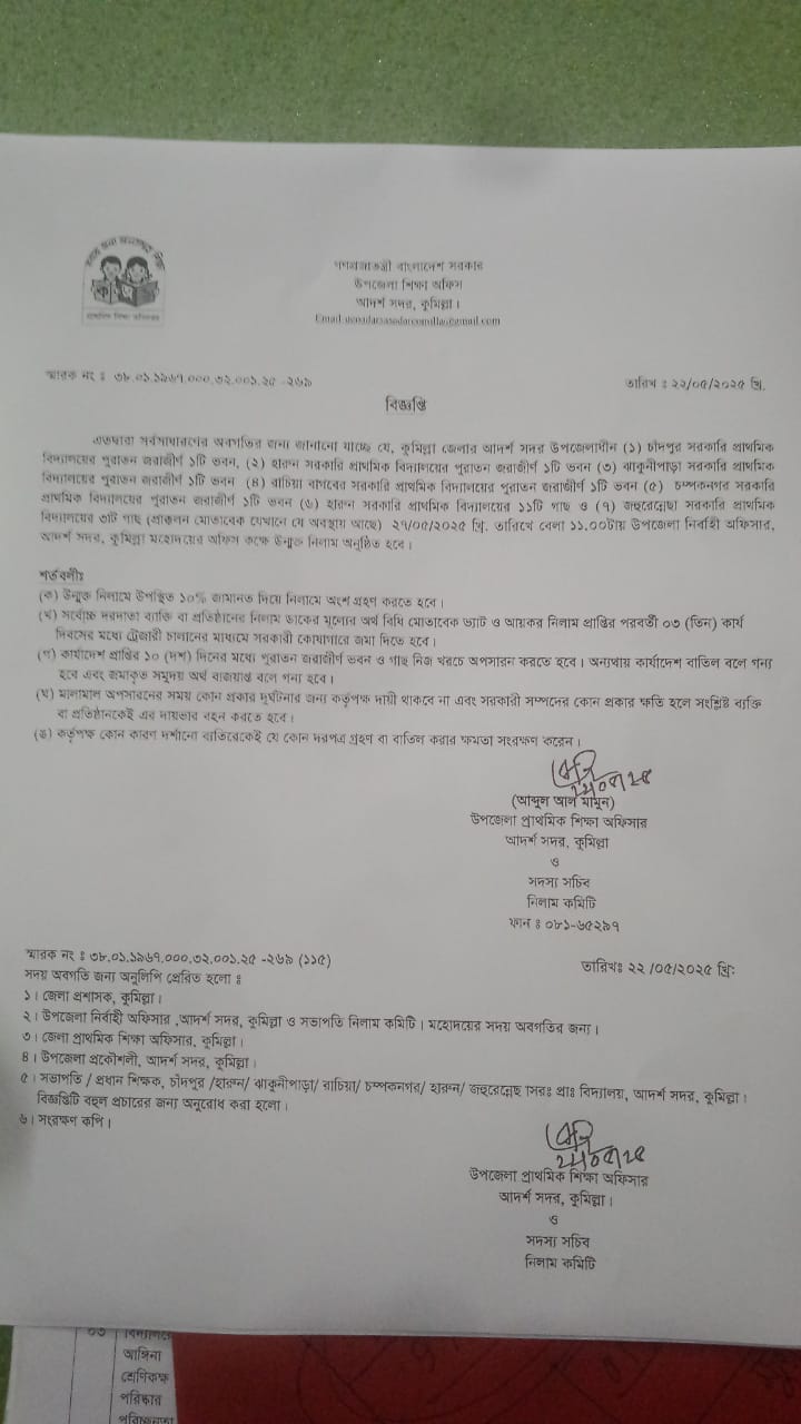 এতদ্বারা সর্বসাধারণের অবগতির জন্য জানানো যাচ্ছে যে, কুমিল্লা জেলা আদর্শ সদর উপজেলাধীন পাঁচটি সরকারি প্রাথমিক বিদ্যালয়ের জন্য ভবন এবং দুটি সরকারি প্রাথমিক বিদ্যালয় গাছ উন্মুক্ত নিলাম প্রদান করা হবে। ২৭/৫/২০২৫ তারিখ বেলা ১১ ঘটিকায় উপজেলা নির্বাহী অফিসার আদর্শ সদর, কুমিল্লা মহোদয়ের অফিস কক্ষে উন্মুক্ত নিলাম অনুষ্ঠিত হবে।